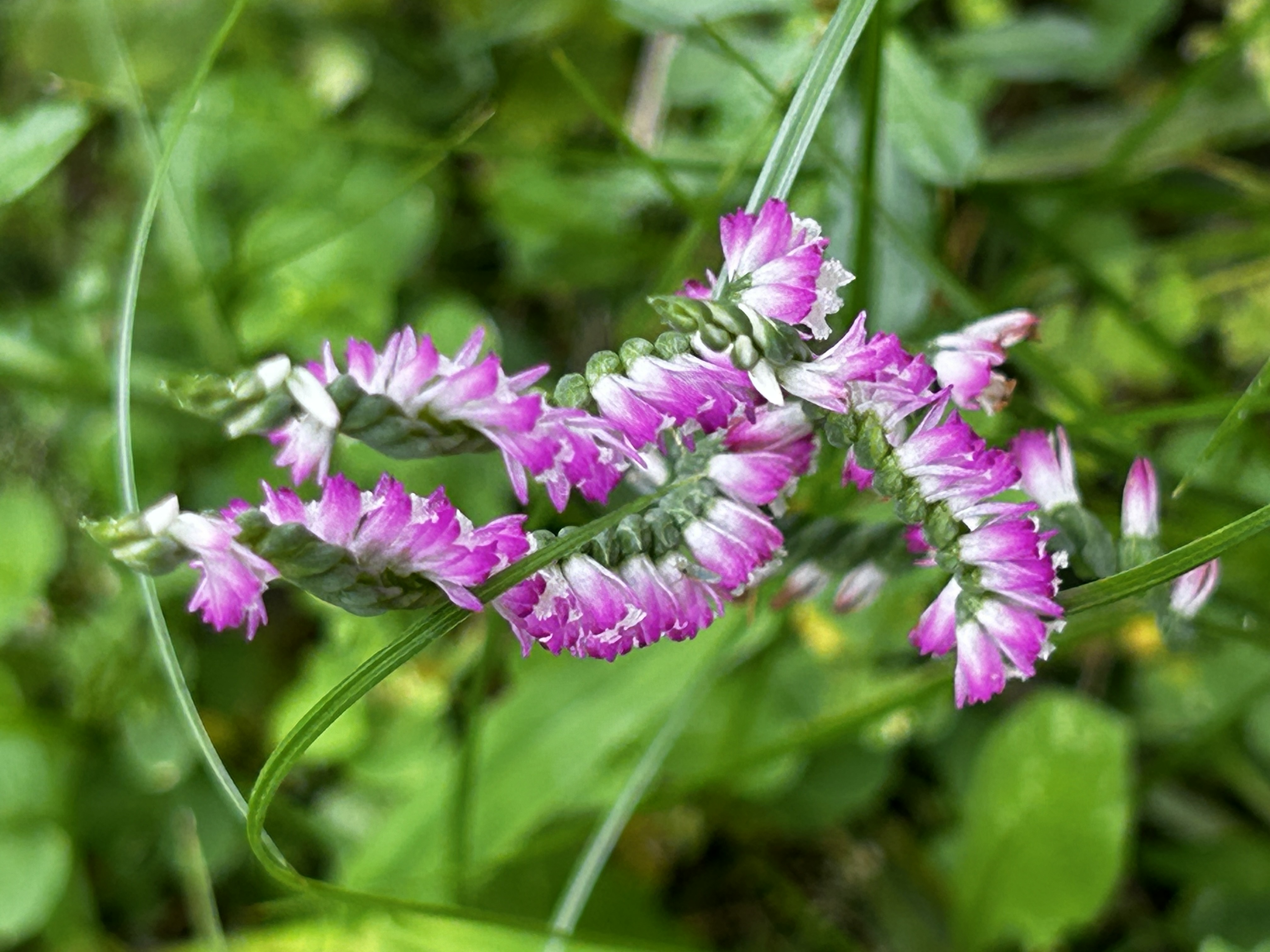 而且,原本当天下午我就要来院子除草了,想不到邻居竟然眼尖发现这株特殊的花草:「盘龙蔘」。经过邻居的说明,我也才第一次认识这种植物。原来,它的正式名称为「绶草」,名称来自其整排的花序有如绶带一般,故得名,「维基百科」上说,因为其花序又如红龙或青龙般盘绕在花茎上,肉质根似人蔘,故绶草也常被称为盘龙蔘。是台湾原生种小型野生兰花,或许也是体型最小的兰花了。