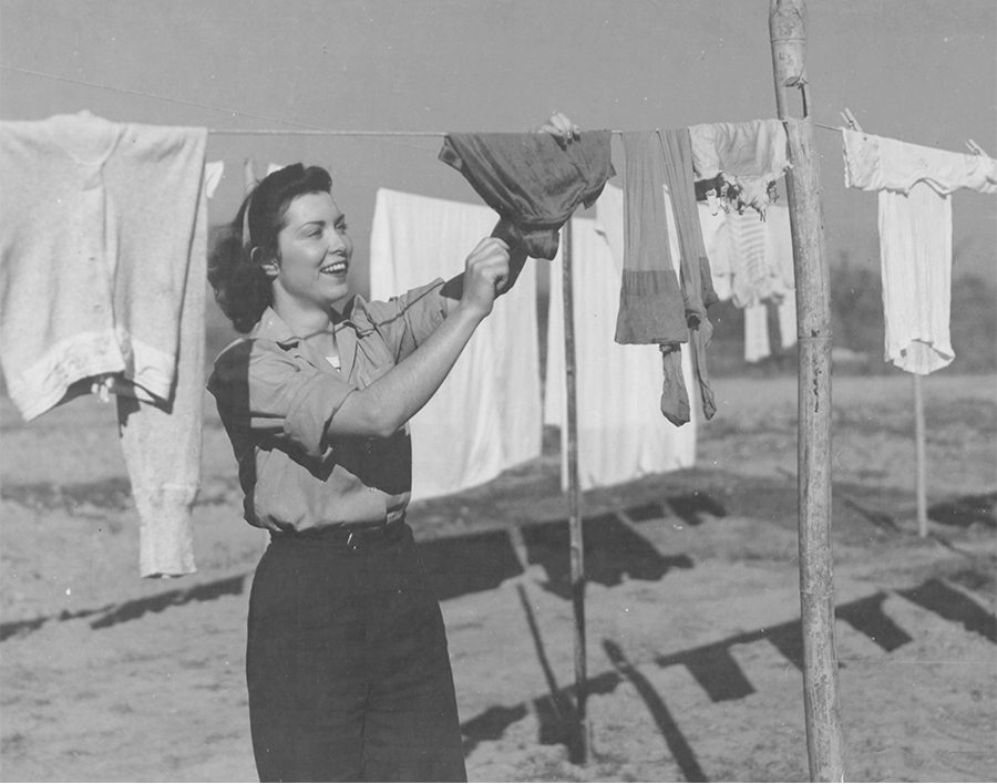 △ 军中护士晾晒衣服︰美国加利福尼亚州好莱坞(Hollywood, California)的伯尼·曼宁(Bernie Manning)中尉是第803空中疏散运输中队(803rd Air Evacuation Transport Squadron)的一名护士,她正在晾干衣服。该中队驻扎在印度上阿萨姆邦(Upper Assam)的查布阿(Chabua)。