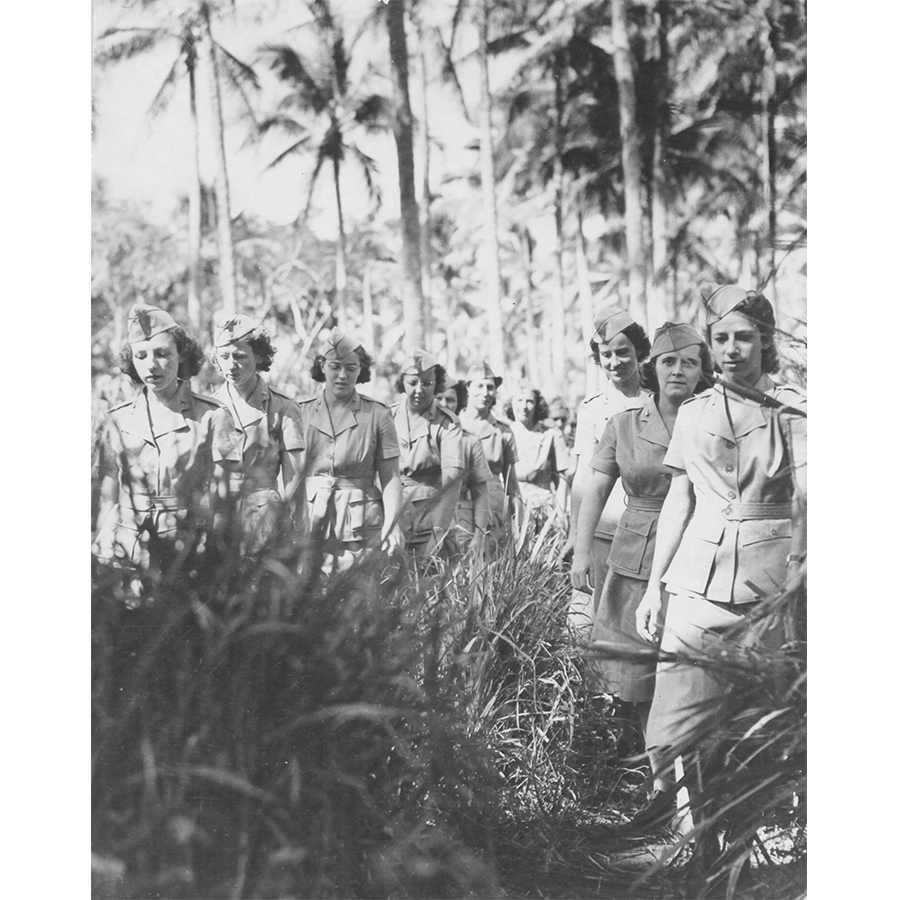 △ 陆军护士穿越丛林︰陆军护士穿越棕榈树荫下的丛林,熟悉他们在空军服役的加勒比地区(Caribbean area)茂密的丛林。这套服装是热带气候下护士的制服。