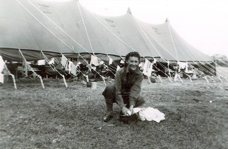 △ 戴着头盔洗衣服的陆军护士︰二战时,美国陆军护士(Jan Shimp)戴着钢盔在诺曼第的牛牧场洗衣服。请注意,衣服挂在帐篷绳上晾干。