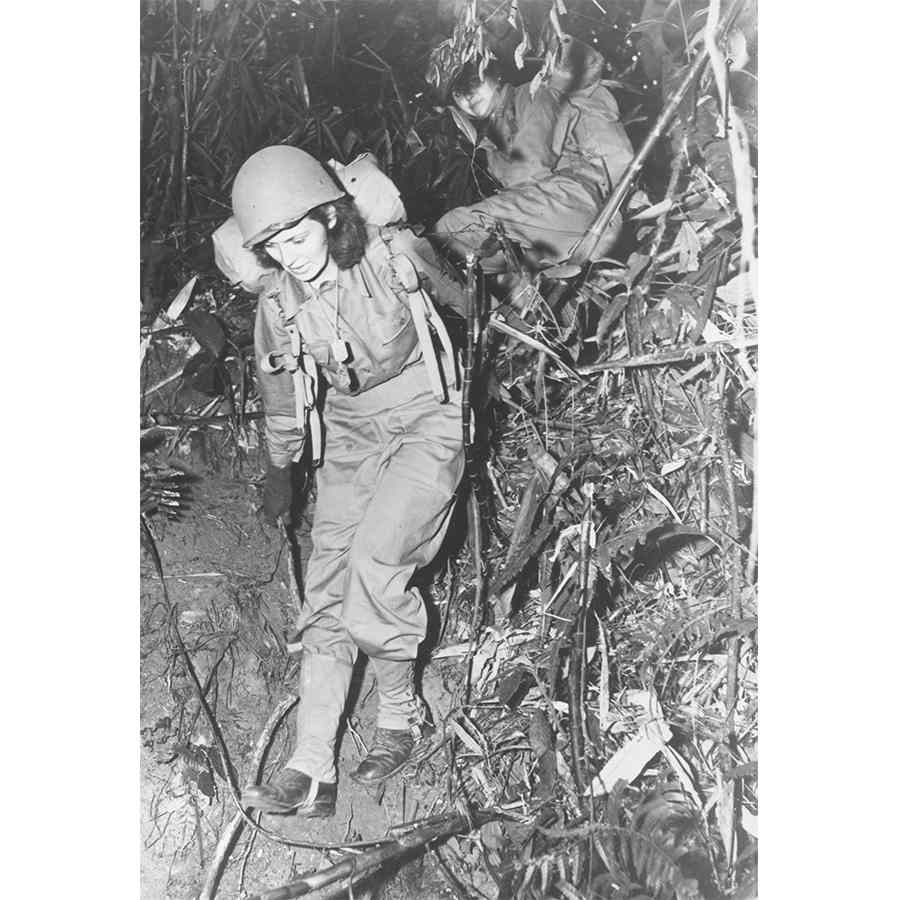 △ 陆军护士徒步穿越印度-缅甸边境丛林︰两名美军护士背着沉重的战斗背包徒步穿越印度-缅甸边境地区的丛林8英里,这是她们接受前线任务前期训练的一部分。在报到之前,美军护士要学习如何应对丛林危险,以及如何在有限条件下照顾自己和病人。