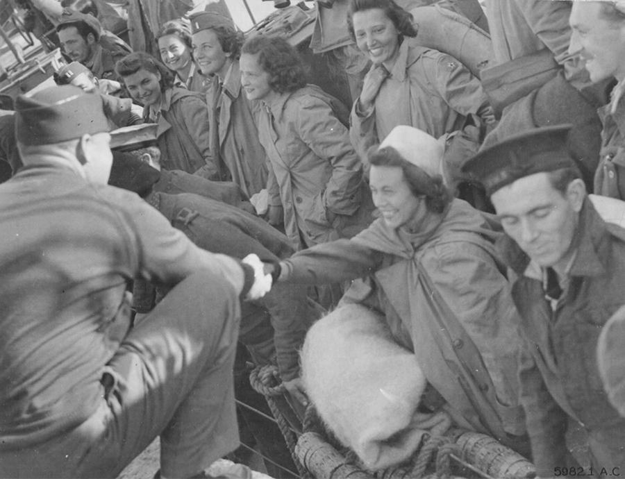 △ 欢迎从阿尔巴尼亚归来的军中护士和医务人员︰大家热烈握手欢迎这14名军中护士、17名医务人员,以及疏散部队的机组人员,他们在从意大利的西西里(Sicily)飞往巴里(Bari )的途中被迫降落在阿尔巴尼亚(Albania),失踪了两个月。