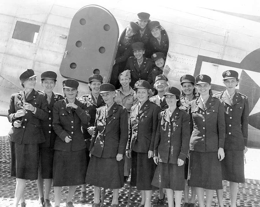 △ 美军护士抵达夏威夷希卡姆机场︰1942 年,日军在菲律宾马尼拉湾的科雷吉多岛(Corregidor)俘虏了这些美军护士。 1945年2月3日,美军第一骑兵师将这些护士连同3,700名战俘,从马尼拉圣托马斯拘留营(Santo Tomas Internment Camp)解救出来。这些护士后来都获颁铜星勋章,并晋升一级。照片拍摄于1945年2月20日威夷的希卡姆机场(Hickam Field, Hawaii)。