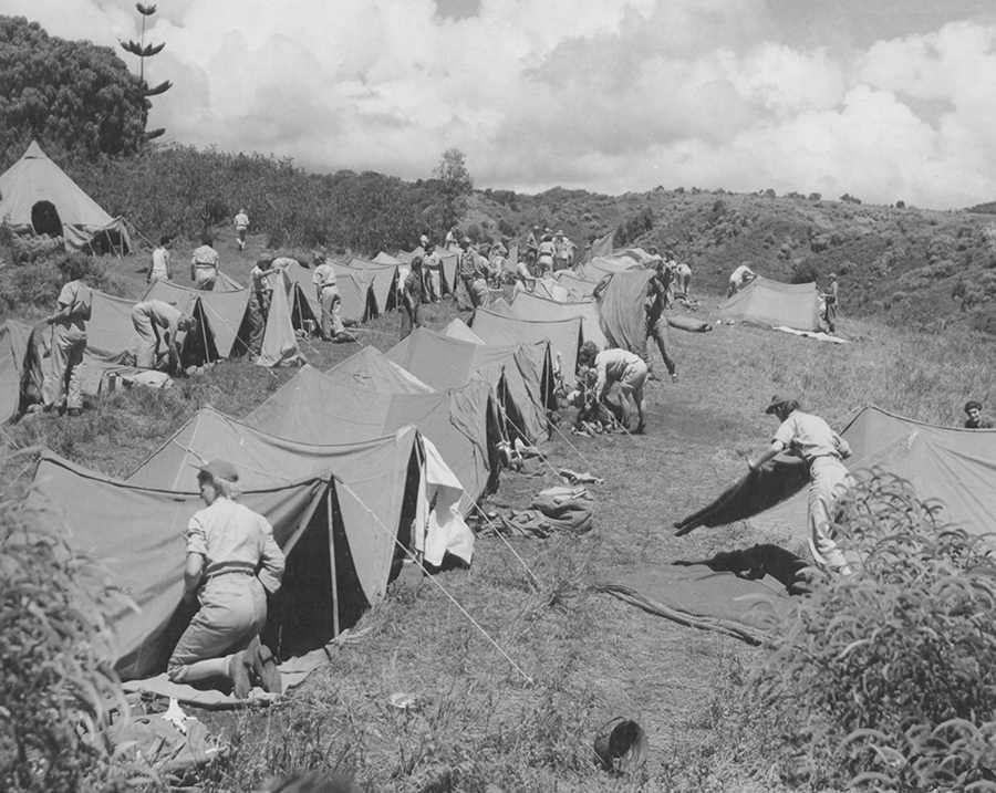 △ 陆军护士在露营区进行丛林训练︰第7航空大队的航空护士在夏威夷瓦胡岛(Oahu, Hawaii)的露营区,进行丛林训练。 1944年5月21日。