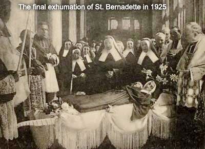 1909年9月22日,在负责其列真福品及列圣品申请事务的代表、两名医生以及一位修女会成员的共同见证下,伯尔纳德·苏比鲁(Bernadette Soubirous)的遗体被首次开棺发掘。在场人员宣称:尽管她手中握持的十字架和玫瑰念珠均已氧化变色,但她的遗体却完好无腐。工作人员对遗体进行了清洗并重新穿戴衣物,随后将其安葬在一具全新的双层棺椁之中。