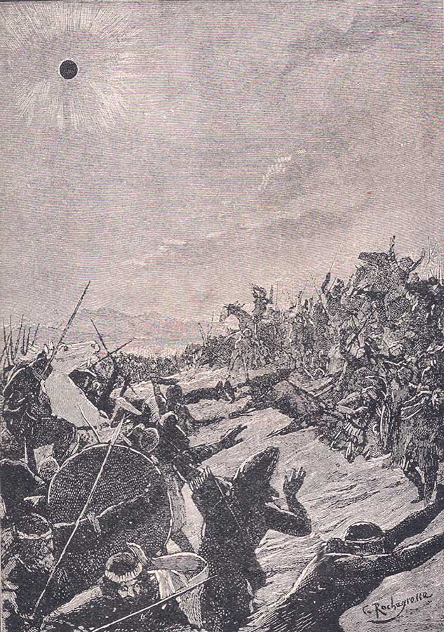 希腊历史学家希罗多德记录了吕底亚人和玛代人(古代伊朗人)之间的一场战争。经过六年的战斗,双方僵持不下,互有胜负。根据希罗多德的记载,"白昼突然变成了黑夜",世界一片黑暗。冲突双方看到日食后,立即停止了战斗,匆忙与对方讲和。