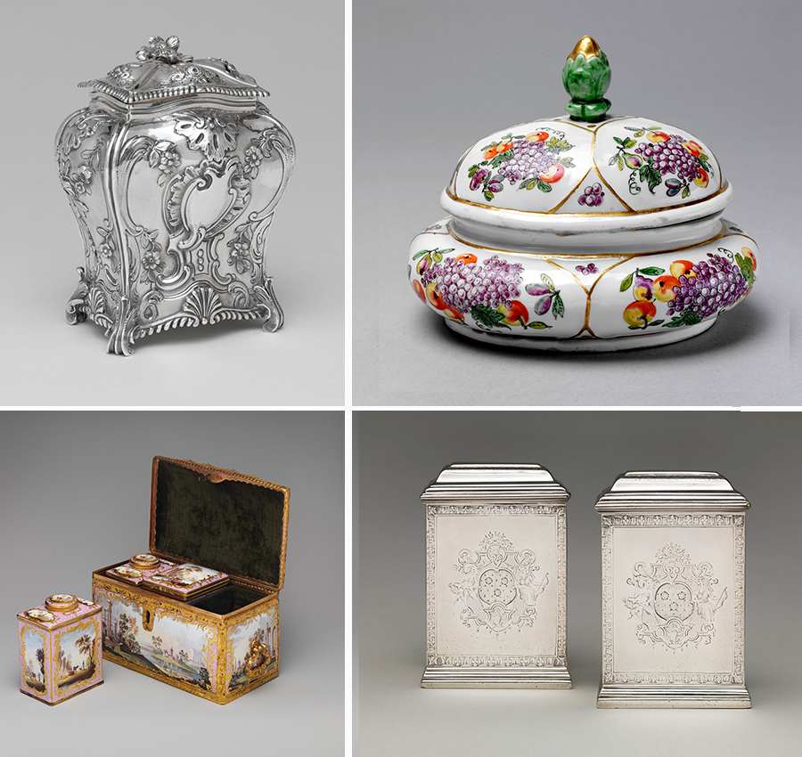 △ 上左图为1762年,英国,银器,茶叶罐。上右图为1730 年,奥地利,硬质瓷盒。下左图为1770年,英国,铜质叶罐,白色珐琅。下右图为1726年,英国,茶叶罐。