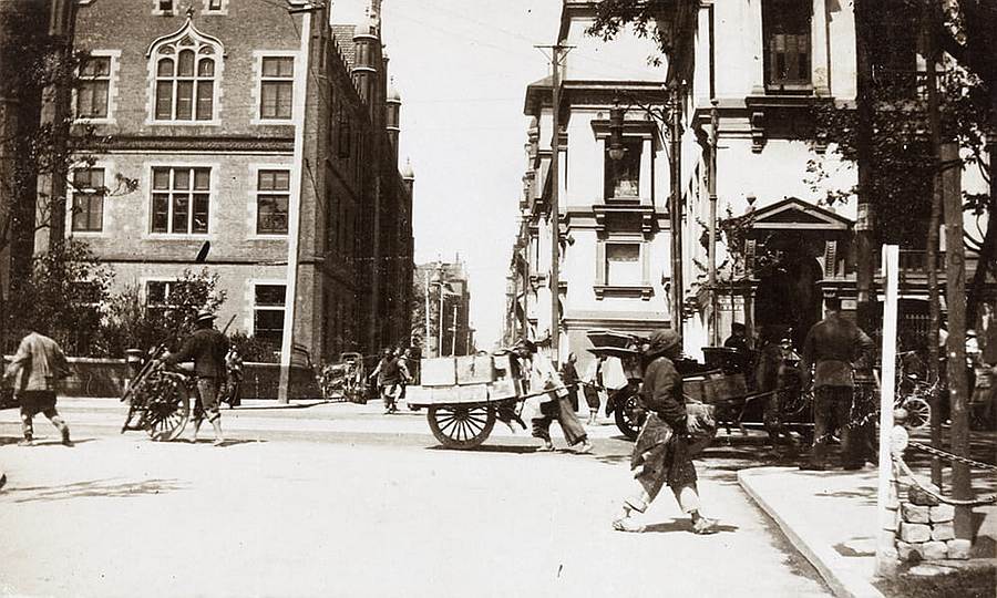 △ 上图展示1911年5月上海外滩的景象(汉口路)。图左是毗邻中国海关大楼。图右是德亚银行(DAB; Deutsch-Asiatische Bank)上海分行。如今鲜有人知晓这家银行,但在20世纪初,它却是中国外资银行中的佼佼者。