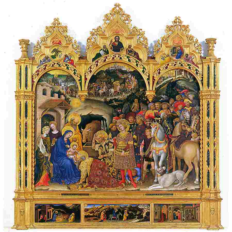 △2. 《三博士朝圣》(Adoration of the Magi, Gentile da Fabriano)︰这幅来自十三世纪的祭坛画被认为是国际哥特式风格的最佳范例之一。一个富裕的家庭用这幅画作为其私人教堂的装饰,它描绘了三位智者通过星星的启示,得知耶稣基督的诞生。在乌菲兹美术馆5号和6号室内还可以看到许多其他经典作品。