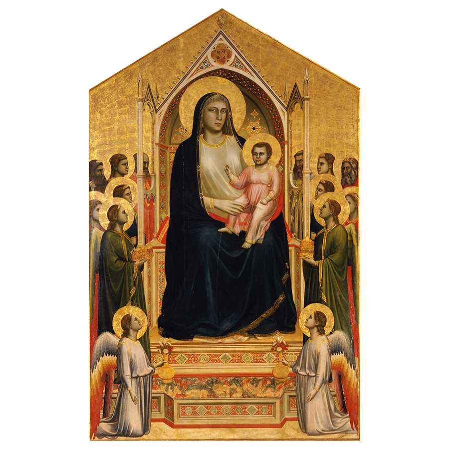 △1.《圣母像》(The Ognissanti Madonna)︰乔托(Giotto)在1305年创作的这一巨幅祭坛画位于2号展厅,中间是该展厅中另外两件着名的艺术作品:《圣三一圣母像》(Santa Trinita Maestà)和《鲁切拉圣母像》(Rucellai Madonna)。 乔托使用明暗对比、地平线和色彩,将像这幅这样的二维画作创作成三维空间的模拟,因此被尊为现代绘画的创始人。