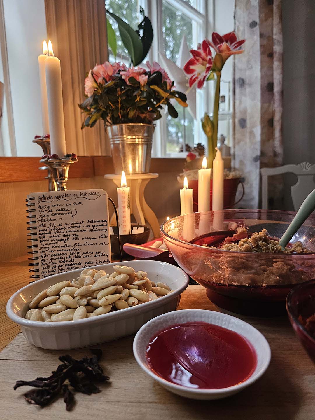从12月开始,瑞典的家庭就经常一起全家制作圣诞糖果,并且一次会准备多种不同的糖果,而不是只做一种甜点。糖果、饼干和糕点会与客人分享,作为礼物赠送,并在整个节日期间享用。常见的糖果包括硬太妃糖(knäck)、软巧克力(ischoklad)、薄荷糖(polkagris)。常见的烘焙点心有薄姜饼干(pepparkakor)和藏红花面包(lussekatter)。 (图片©️中土杂志|Pernilla Gäverth)