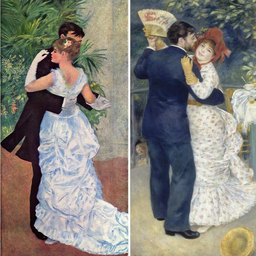 △《布吉瓦尔之舞》与雷诺亚的另外两幅画作《城市之舞 》(Dance in the City,上图左)和《乡村之舞 》(Dance in the Country,上图右)非常相似,画作中的人物尺寸几乎是真人大小。《城市之舞 》中描绘了一个正式的舞会,《乡村之舞 》中描绘了乡村舞蹈,而《布吉瓦尔之舞 》中则描绘了更非正式的户外活动。这些画作全部在1883年1月至4月之间完成,有艺评人将其描述为「雷诺亚职业生涯中最富有成效的三个月」。