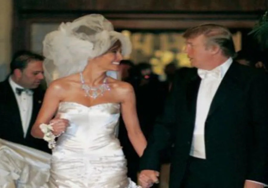 △ 2005年,梅拉尼娅(Melania Knauss)与特朗普(Donald Trump)结婚。她的连衣裙由Dior 设计,采用300 多英尺的薄纱。这件衣服的成本估计为10万美元至20万美元。它由超过1,500颗珍珠和莱茵石设计而成。特朗普后来担任美国第45任总统(2017–2021)。