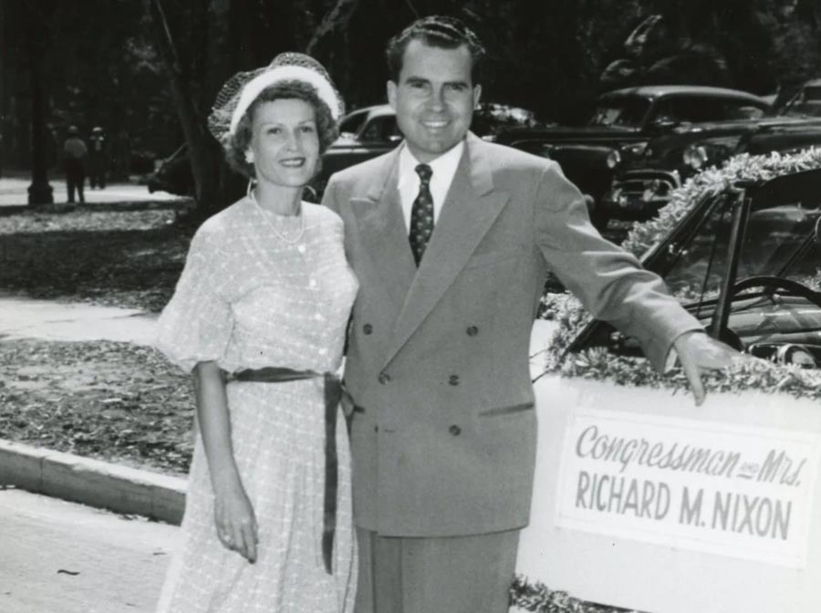 △ 早在臭名昭著的「水门事件」(Watergate scandal)发生之前,尼克森(Richard Nixon)就在一场社区戏剧的试镜中认识他的妻子塞尔玛(Thelma Catherine Ryan)。他们于1940年6月在加利福尼亚州里弗塞德(Riverside, CA)结婚,并在墨西哥度蜜月。尼克森后来担任美国第37任总统(1969–1974)。