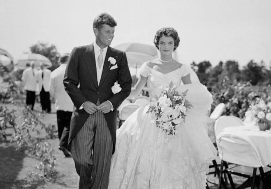 △ 在贾桂琳(Jackie Bouvier)与约翰·甘迺迪(JFK)结婚前10天,时装设计师安·罗威(Anne Lowe)为贾桂琳设计的礼服在一次水管破裂意外中被毁。凭借熟练的裁缝团队、大量的后勤的帮助,这位著名设计师创造了总统婚礼的奇迹。甘迺迪后来担任美国第35任总统(1961–1963),于1963年11月在德克萨斯州达拉斯(Dallas, Texas)遇刺身亡。