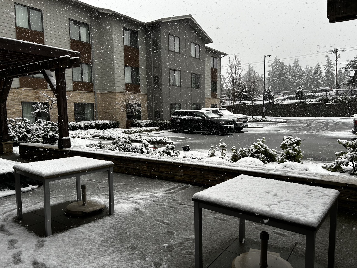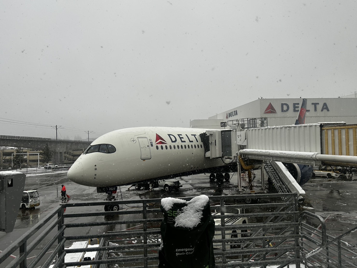 等到中午从饭店退房后,我突然发现原本计划的西雅图市区之旅要泡汤了。因为一方面大雪还在下,我没有雨伞,也没有雨衣,这样走出去,身上的衣物沾到雪花,一定会湿透。另一方面,我穿着工作用的鞋子,也不适合在雪地行走,会有滑倒与湿掉的风险,更何况,我还得拖着一个大行李箱。无奈之余,只能搭乘饭店接驳车直接回机场,没有其他地方可以去。