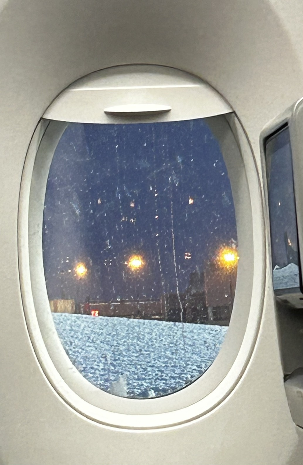 想不到,在机上又坐了半小时之后,机上又广播说,因为下雪导致机翼积雪,需要除雪车来协助除雪,请大家再等待一下。过了不久,就听到窗外有除雪车喷水的声音,然后看着两边的机翼上的积雪也不断地消融。第一次在飞机上看着机身除雪,有种开车进去自动洗车机洗车的感觉,倒也是新鲜的体验。