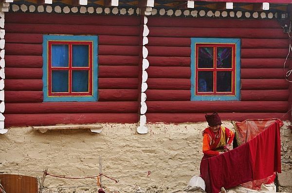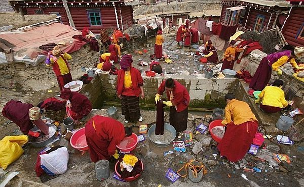 色达喇荣佛学院的女僧人在洗衣服。(2006年11月4日)