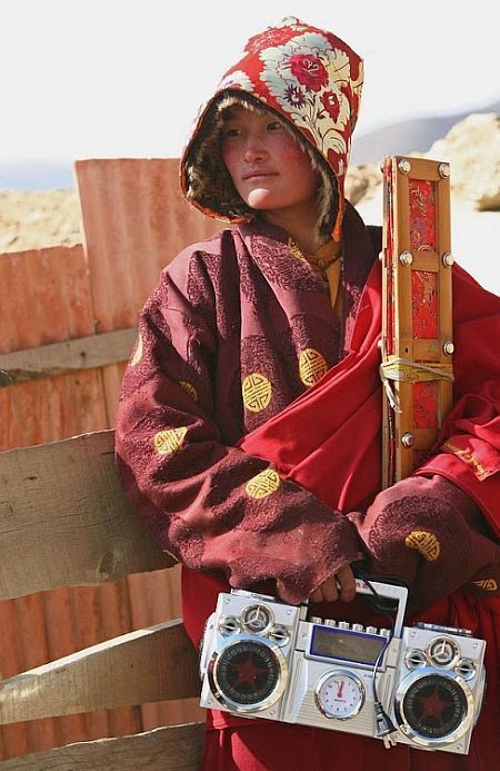 色达喇荣佛学院的一名女僧人,手持佛经和一台便携式立体音响,准备聆听一名大师的开讲。(2006年11月4日)