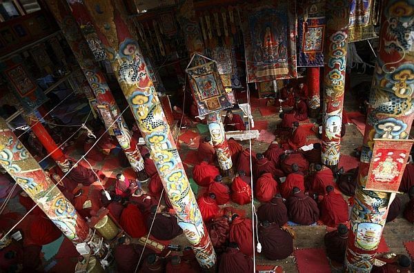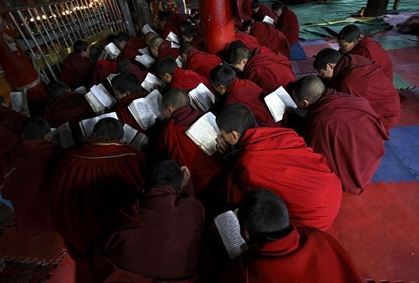 色达喇荣佛学院的喇嘛们在学习佛经,并聆听大师开讲。(2007年11月11日)