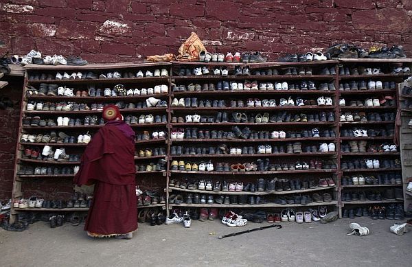一名喇荣佛学院的女僧人在进入佛堂前,把她的鞋子放在架子上。(2007年11月11日)
