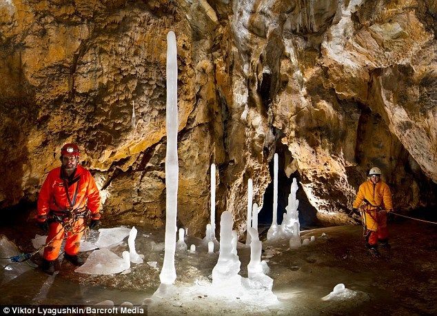 俄罗斯彼尔姆地区的孔古尔冰洞,两名探洞者注视着巨大的冰柱。即使外面的温度达到35摄氏度,孔古尔冰洞内仍旧是一片寒冬景象,被形象地称之为“永冬”。