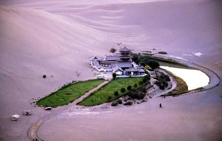 莫高窟作为一座沙漠中的寺院,还有鸣沙山、月牙泉相伴,但却是别具一格,举世无双。鸣沙山和月牙泉的神奇在于鸣沙山刮风时沙子不往山下走,而是从山下往山上流动,所以月牙泉永远不会被沙子埋没,始终碧波荡漾,清澈透明,风景十分优美,鸣沙山也不会因沙漠滑沙而高度降低。
