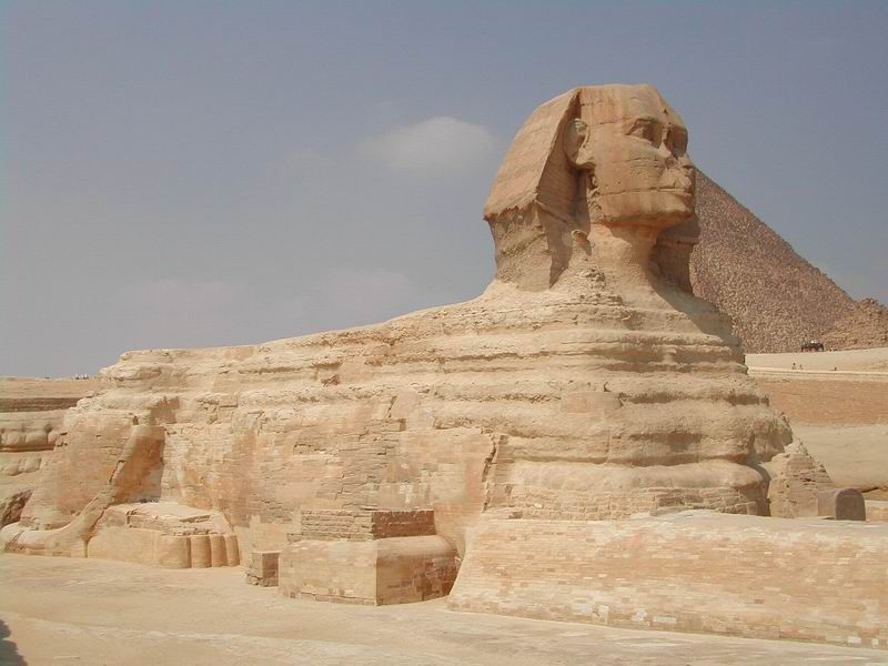邻近大金字塔的狮身人面像,看起来非常的古老。科学家们从他身上似水侵蚀的沟渠研判他曾经历了一段潮湿的气候,因此推测他很可能在一万年以前就已存在。