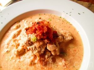 3、(陶瓷)锅中入豆浆,开中小火加热,同时,放入马铃薯泥和毛豆仁。至温热程度,将薄猪肉片连芝麻沙拉酱腌料一起倒入,加入寿司醋。转小火继续加热至豆浆沸纹起,马上熄火。