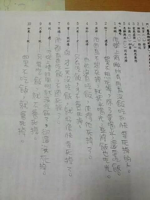 只见“吃饭”与“死掉”两个关键字贯穿10个句子,分享者表示:“不知道多久没吃饭才有如此深的怨念?”也俏皮的说:“大家要吃饱才有力气写作业喔~”