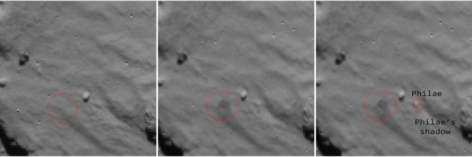 左图:菲莱着陆前;中图:菲莱着陆后扬起的尘土;右图:菲莱和它的影子
