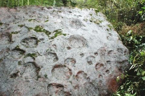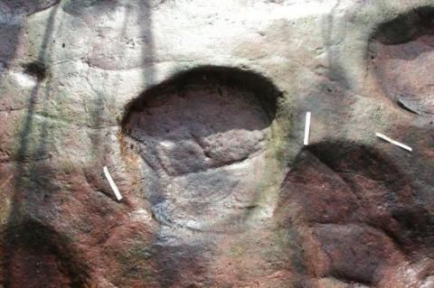 工作员说,该化石群大多数分布在山上滑落下来的嶙峋巨石上。据他初步统计,这十余块巨石上分布着200多个恐龙足迹化石。最大的蜥脚类恐龙足迹,长 60cm、宽54cm,最大的兽角类恐龙足迹,长30cm、宽33cm,最小的是鸟脚类恐龙 足 迹 ,长宽都不足10cm。另外,还有一些分布在石板滩上,形成一道近10米长蜥脚类恐龙行迹,该行迹迹由多个足迹组成。