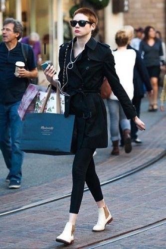 苏格兰女演员Karen Gillan的街头look酷感十足。纯白皮质踝靴在一身纯黑行头中更为抢眼,黑色九分裤露出一截的小腿,在视觉上有助于拉长腿部线条。亮铜色短发与白色踝靴,这两道亮色让Gillan的“黑衣人”造型多了几分俏皮味道!