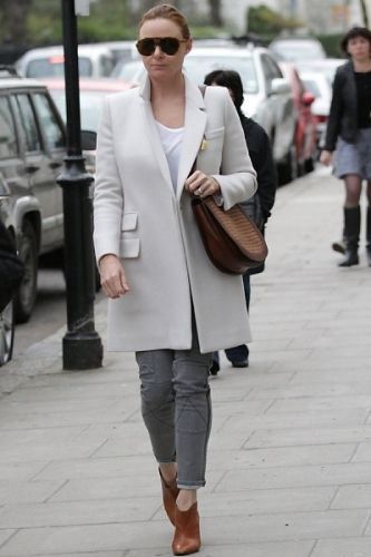 以一身灰白棕色系出街的Stella McCartney,在色彩搭配上展现了超人技巧。棕色踝靴、棕色手袋以及玳瑁墨镜在颜色上相互呼应,你还可以学McCartney搭配灰白色呢子大衣和浅灰色牛仔裤,视觉感柔和的灰白棕在这个浪漫深秋再适合不过了!