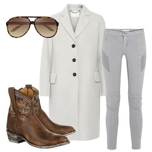 棕色踝靴+灰白大衣+浅灰色牛仔裤