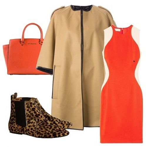 豹纹踝靴+橙色迷你连衣裙+驼色大衣