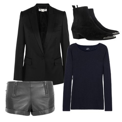 黑色踝靴+皮质短裤+薄棉卫衣+西装外套