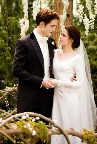 直到Bella嫁给了Edward时,一切问题都已经交给了时间。一袭丝绸花边白色修身,二人深情凝视,与他们史诗一般的浪漫婚礼如此合拍。