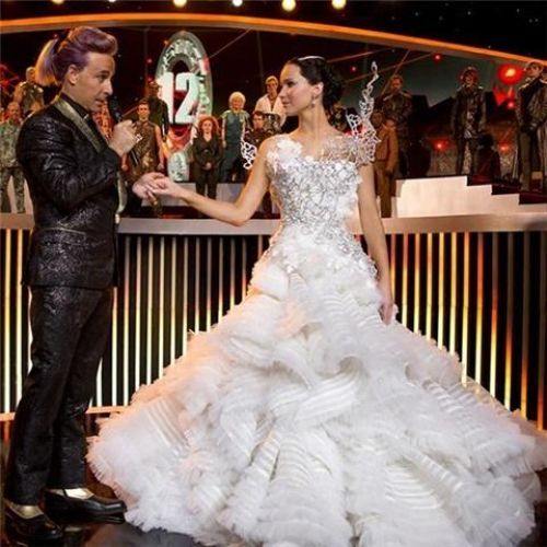 影片中Katniss身穿层叠硬质透明婚纱,深情的挽着President Snow的双手。Tex Savario设计此款婚纱时,融入了“范特西”风格,在上半身的银色火焰树上,运用了上千颗施华洛世奇水钻。抛开影片本身,也让观众们饱足了婚纱设计的视觉盛宴!