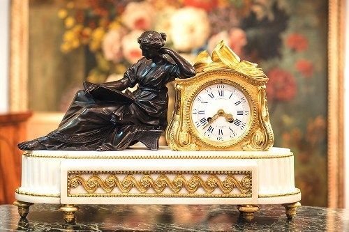 此外,法国人同 样喜爱那些生活在人间,能带给人们无尽灵感的现实版缪斯。这些女神做的事情也更为实际,例如,为一些伟大的思想家们举办派对,或者操办那些举世闻名的精致 茶会。许多艺术家也乐於将这些摸得着、看得见的人物放置在座钟上,这其中最着名的莫过於Geoffrin夫人。这位当年名满巴黎的美貌贵妇,曾经营着当时 法国最举足轻重的一家沙龙,里面云集着赫赫有名的众多政治家和艺术家,包括法国历史上最成功的肖像画家之一Jean Marc Nattier。正是他在1738年为Geoffrin夫人绘制了一幅肖像画,上面是夫人正在读书时的场景,後又被人翻制成雕像。