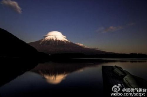 富士山顶出现奇特环绕云 像戴一顶帽子
