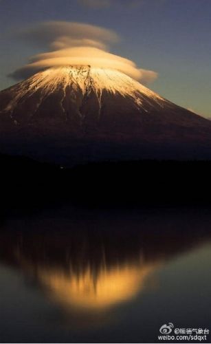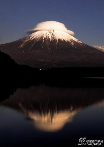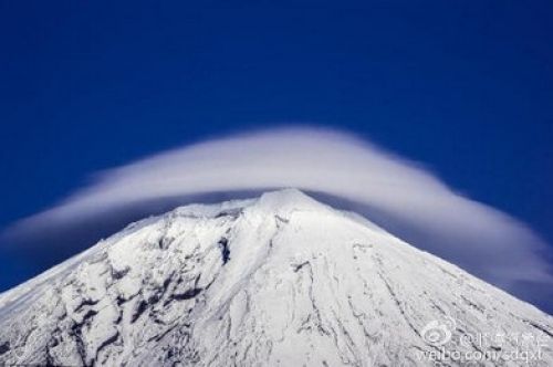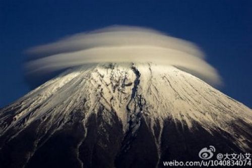 作为世界文化遗产、日本重要的象征之一,“富士山”被视为圣山。晴朗的天空,由潮湿气流形成神奇的云层,环绕於富士山顶,形成了一美丽奇特的景象,宛若给富士山戴上了一顶“帽子”。
