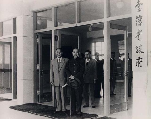 图注:五十年代末,蒋介石、周至柔(左)、唐纵(右后)于台湾省政府门前合影