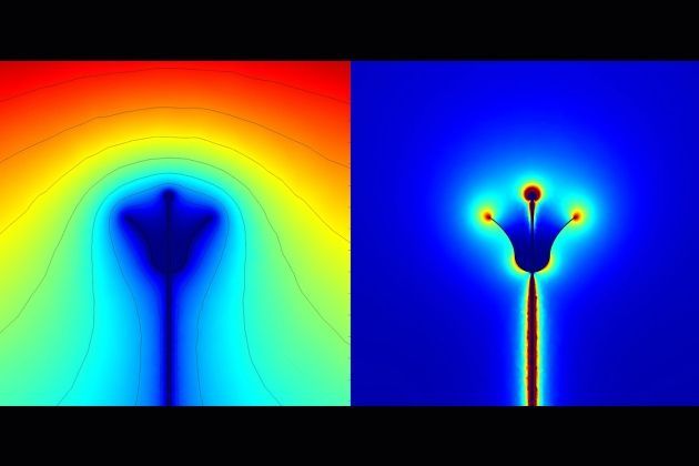 这些图显示了一朵理想状态下的花周围的微弱电场。英国研究者发现蜜蜂能感知到这些电场:蜜蜂可以在花上留下正电荷,别的蜜蜂可以借由它判断这朵花值不值得访问。