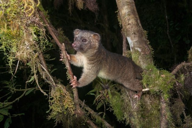 这是安第斯地区森林里的一种新陆生哺乳动物:倭犬浣熊(Bassaricyon Neblina),一次难得的新发现。研究者先是怀疑博物馆里的浣熊标本可能其实是一种新物种,待在其产地搜索过后正式确立了这个新种。然后他们才后知后觉地发现美国的动物园之前就养过一只倭犬浣熊。