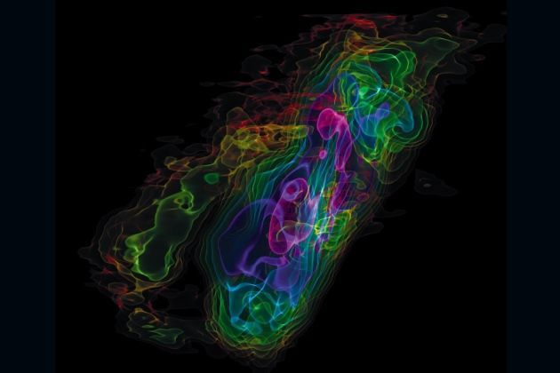 每年,强劲的宇宙风把相当于9个太阳的质量吹出NGC253星系。智利的阿塔卡玛射电望远镜能对风中的一氧化碳分子成像,其无与伦比的精度可以显示其喷射的强度。图中,强度低的区域是红色的,而强度高的区域则是蓝紫色的。