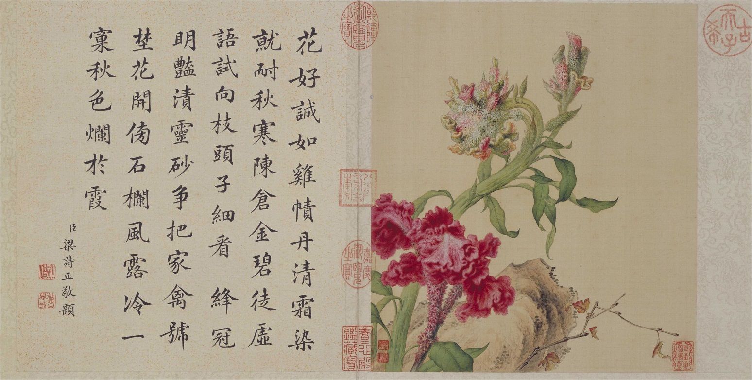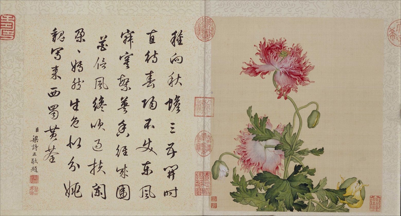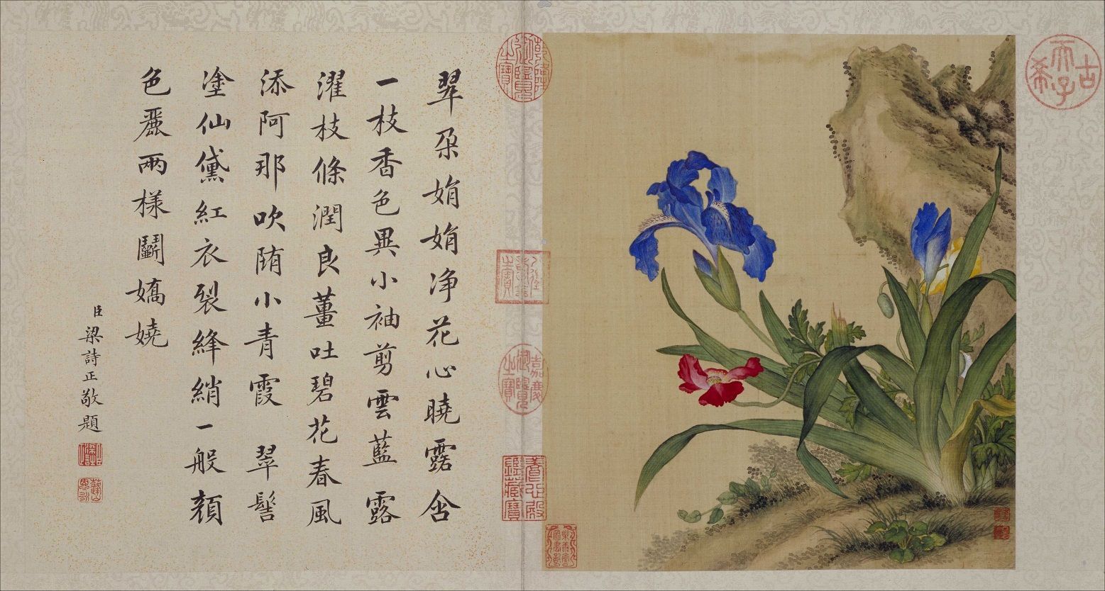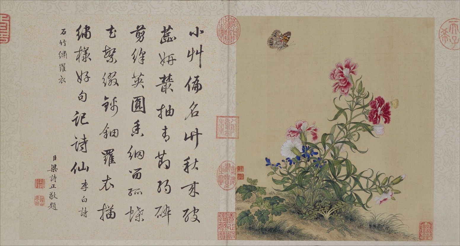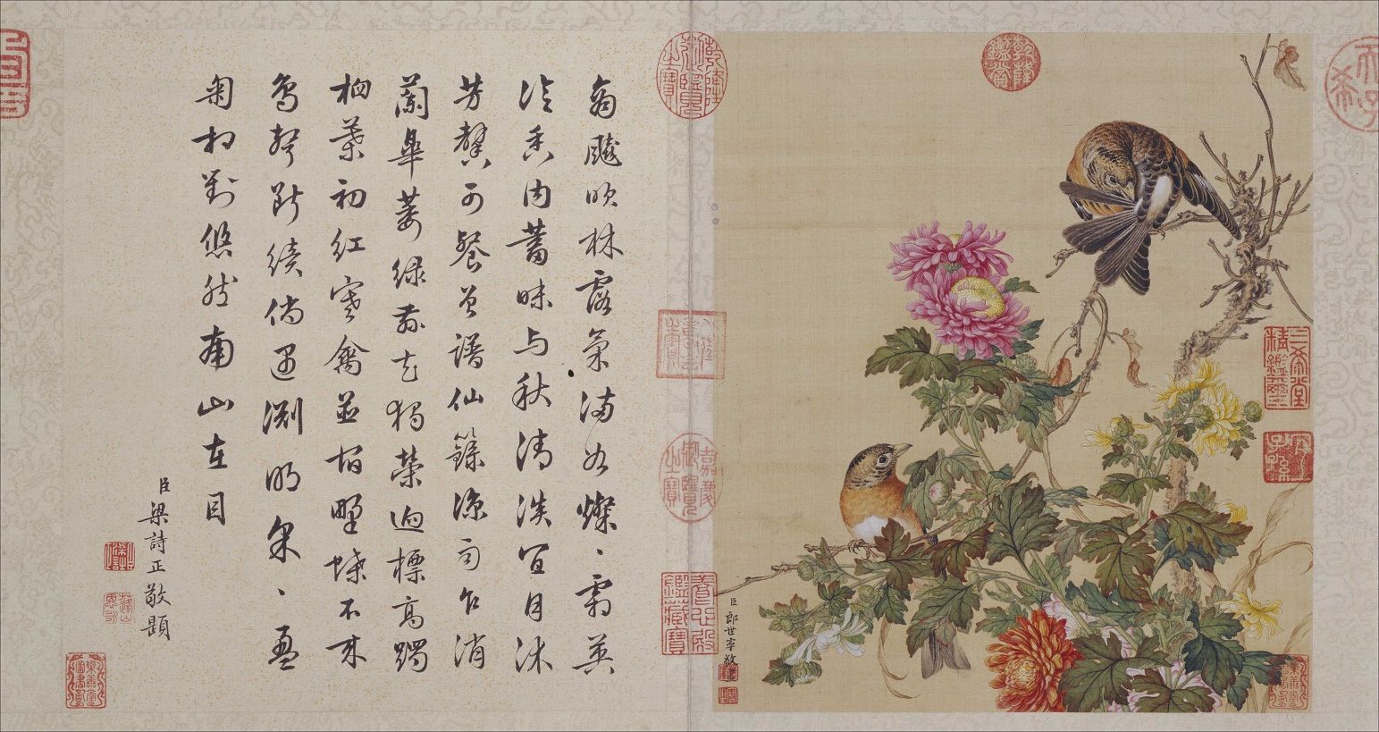 《花鸟图》册,清,郎世宁绘,绢本,设色,共十开,每开纵32.6cm,横28.6cm。款署:“臣郎世宁敬画”,下钤“郎世宁”朱文印、“写生”白文印。每开均有钤“郎世宁”、“写生”印。鉴藏玺印有:“乐寿堂读书记”、“古希天子”、“乾隆御览之宝”、“八徵耄念之宝”、“嘉庆御览之宝”、“养心殿鉴藏宝”等。每开均有乾隆朝内阁大臣梁诗正的题诗。此图册分别描绘了牡丹、兰花、罂粟、萱草、荷花、梅花等艳丽多姿的花卉和体态生动的蝶、鸟。构图上取法中国传统花鸟画的格局,以虚托实,注重对所绘物象的突出。在表现技法上,则充分发挥了欧洲绘画注重明暗及透视的特点,以工致细腻的笔触,刻画出花瓣、叶片以及鸟雀的羽毛质感和体积感,呈现出与传统的中国花鸟画迥然不同的艺术风貌。这种“中西合璧”的画风成为清代宫廷绘画艺术的一大特色,受到了清皇室的青睐。《石渠宝笈》著录。