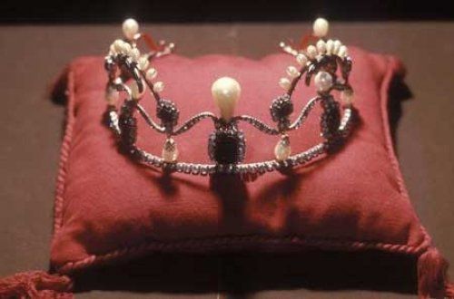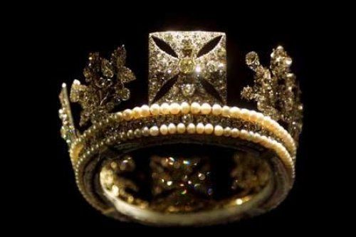这个王冠也属于伊朗末代王后法拉赫巴勒维。她是伊朗历史中第一位被冠以摄政头衔的王后。这个王冠呈红、绿、白三色,这是伊朗国家的颜色,由巴黎珠宝匠Van Cleef和Arpels制造。这顶王冠镶有1469颗钻石,36颗祖母绿,36颗尖晶石和105颗珍珠。王冠前面最大的一颗祖母绿重150克拉。来源:伊朗德黑兰国家银行。