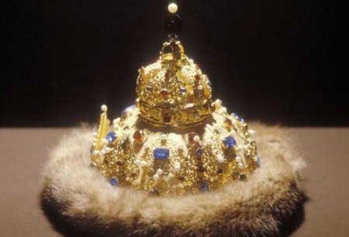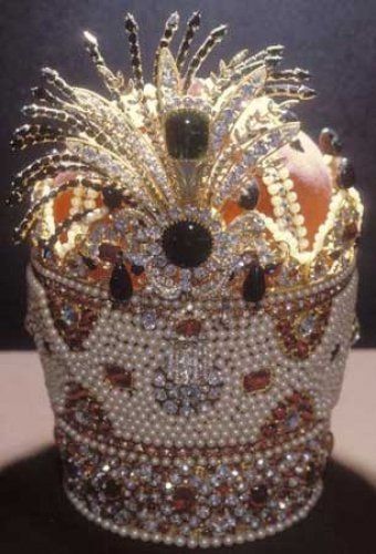 公元17世纪的阿斯特拉罕王冠。纯金制成,镶嵌有45颗钻石,36颗红宝石,21颗蓝宝石,37颗祖母绿和51颗产自霍尔木兹海峡的珍珠。王冠以伊凡四世1556年,在伏尔加河三角洲政府的地区阿斯特拉罕命名。