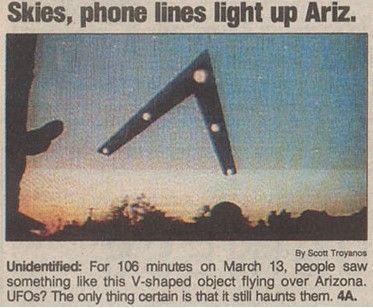 这个事件通常被称为菲尼克斯之光,是由于一个飞碟被大规模的目击。它并不是从菲尼克斯开始的,而是从亨德森内达华,一个男人报告说他看到了一个大大的V形飞船带着底部的六束光从他的头上飞过。这些光线传递到了亚利桑那州,并且被镇上的一个前警察看到,然后同样形式的光线也被普赖斯科特的一些人们发现。几分钟之后,这些光渐渐的向菲尼克斯的南部移动。